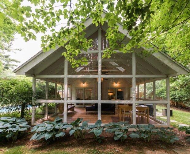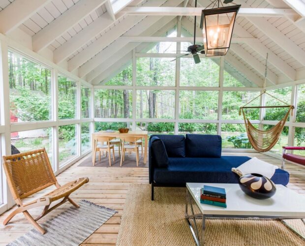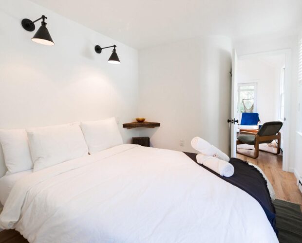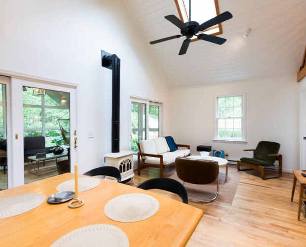 This is the historic Leibhardt church converted into a cozy and chic home with a pool and hot tub. It used to be a Christmas tree farm back in the day! Now it sits on a quiet street with a lovely, breezy yard full of trees to look up at from the swimming pool lounge area.