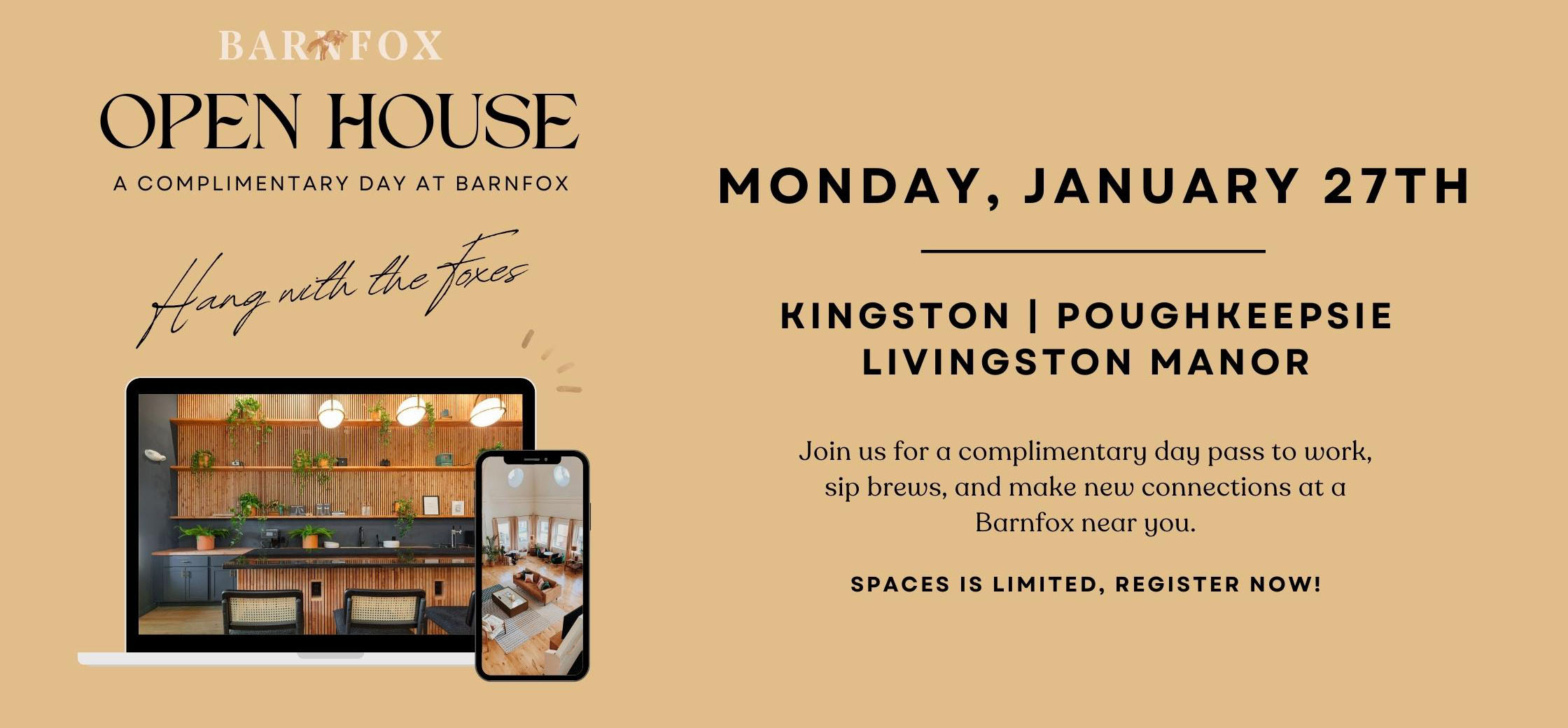 Welcome to the Barnfox Open House coming to Barnfox in Kingston, Poughkeepsie, and Livingston Manor on Monday, January, 27th 2025. Upon registration, expect an email within 1-3 business days confirming instructions, and need-to-knows. We look forward to hosting you at Barnfox!