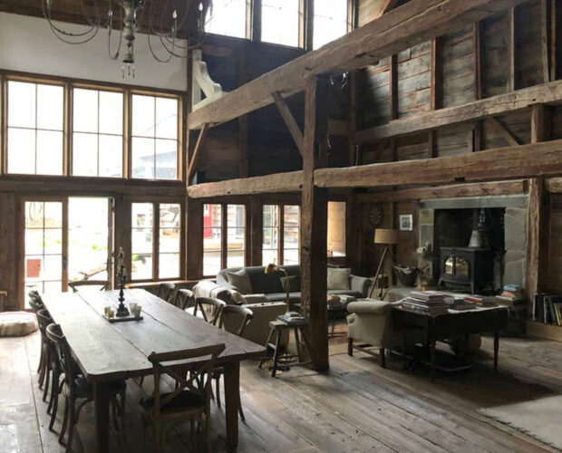 Guests enter the home through The Barn and upon arriving you’ll instantly be taken by the massive open space with a wall of windows looking out onto your own private back garden. The ceilings stretch 30 feet tall and feature original wood beams from 1889—from its former life as a sheep and hay barn.