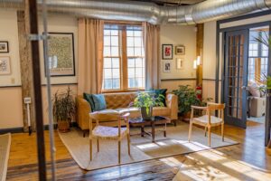 Welcome to the new Barnfox expansion at the Cannonball Factory. Our new space features gorgeous lounge areas, private and shared desk spaces, private offices, multiple meeting rooms, and sound-isolated phone booths. Located in the heart of town, you're steps away from all of Hudson's famous shops, restaurants, bakeries, and cafes.
