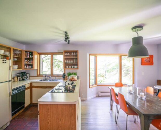 KITCHEN: The kitchen includes an open layout with exposed shelving and a dishwasher for easy clean up. The dining table seats eight and there is a high chair available for children. The kitchen has everything you’ll need to make cooking and grilling with friends and family easy.