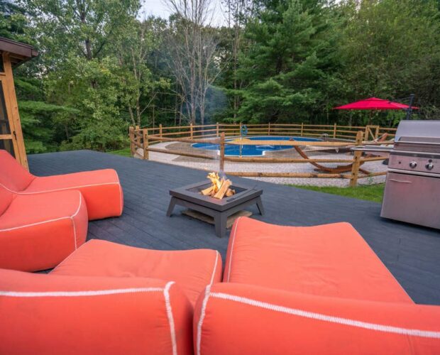 OUTDOOR SPACE: The house offers everything you need for year-round entertaining. A pool with safety fencing and latched gate includes lounge chairs and pool floats. The expansive deck features a screened in porch for outdoor dining, as well as plush outdoor seating and fire pit. Features include a deck with access to a large outdoor dining table for 10 people, a propane grill, in-ground pool, and a wood-burning fire pit. There is a large grassy area for kids to enjoy as well as lawn games. The eight-acre property has an organic garden with grape vines, and apple, pear, and apricot trees.