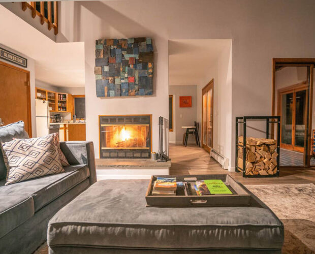 LIVING SPACE: The living room features double height ceilings and a wood burning fireplace as well as a sectional couch for cozying up with a good book or glass of wine. There is a Smart TV as well for movie nights and lazy afternoons.